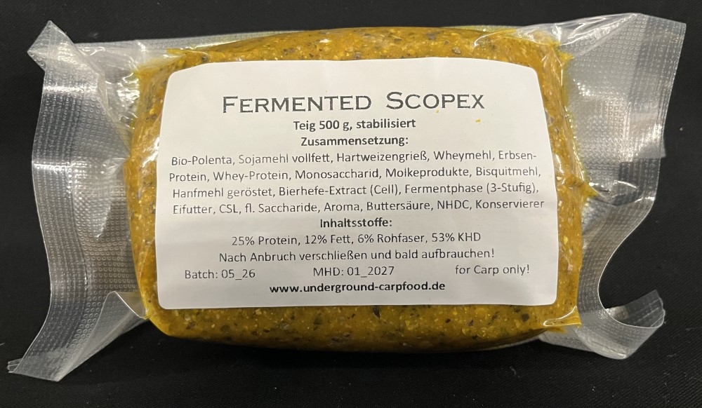 Der passende Teig aus dem originalen Fermented Scopex-Mix. Geboosted mit einer Extraportion Attraktoren und sanft stabilisiert. Ideal, um damit den Hookbait zu ummanteln, aber auch lose mit zugefüttert ein Gamechanger!