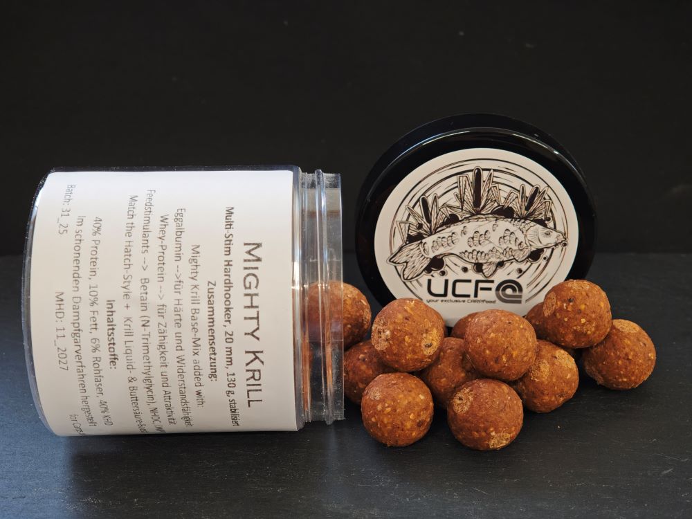 Die passenden Hard Hookbaits zum Mighty Krill. Unsere Hard Hookbaits bestehen immer aus dem zugrunde liegenden Mix, versetzt mit einer Extraportion Attraktoren sowie Eggalbumin und Whey-Protein. Dies macht sie zum einen attraktiver und wahrnehmbarer für die Fische, andererseits härter und widerstandsfähiger z.B. gegen Weißfische oder Krebse. Hard Hookbaits halten dadurch länger am Haar und sind immer dann zu empfehlen, wenn die Umstände den Einsatz nötig machen.